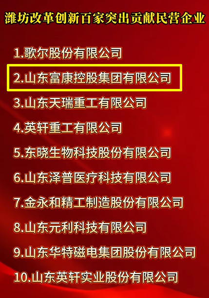 为进一步激励全市广大民营企业以先进为榜样,提振奋发有为的精气神,燃旺锐意改革的创业激情,助力更好潍坊建设,市工商联、市发改委、市科技局、市人社局、市农业农村局、市商务局、市税务局、市市场监管局共同组织开展了2025年潍坊民营企业100强和潍坊改革创新百家突出贡献民营企业申报发布活动,经过企业申报、县市区推荐、专家审核、征求意见、入围公示、审核确定等程序,最终确定两个榜单,近日正式发布。富康集团入选2025年潍坊民营企业100强和潍坊改革创新百家突出贡献民营企业榜单。