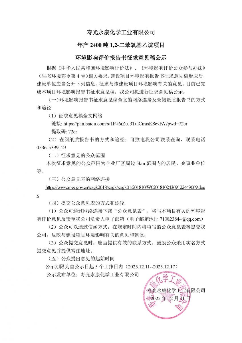 永康年产2400吨1,2-二苯氧基乙烷项目环境影响报告书征求意见稿公示