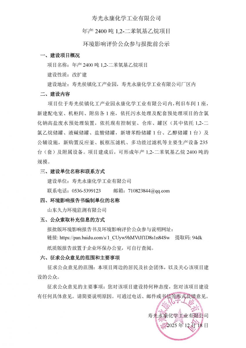 寿光永康化学工业有限公司 年产2400吨1,2-二苯氧基乙烷项目环境影响评价公众参与报批前公示